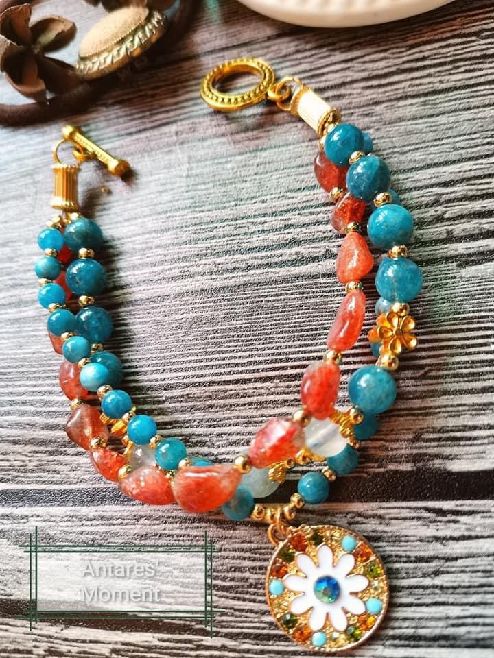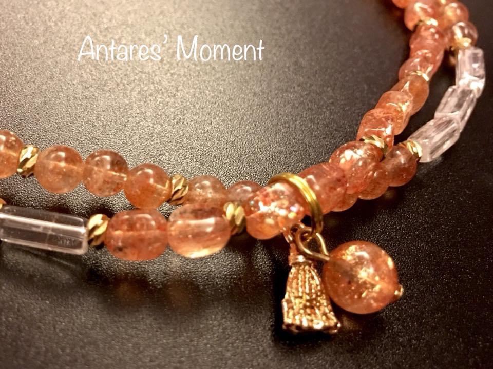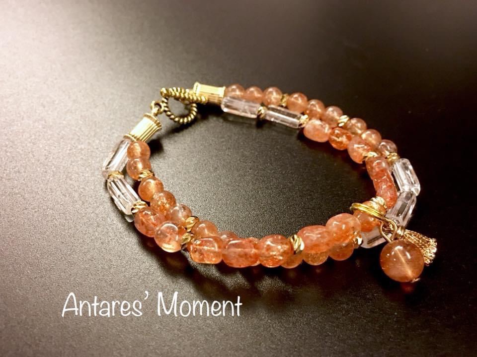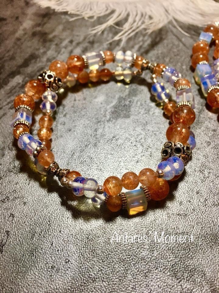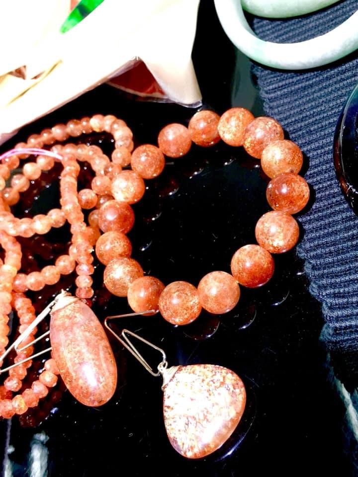 顏色:透明水晶內有橙色的結晶體、高級的太陽石啦內裏有彩色的輪狀閃片